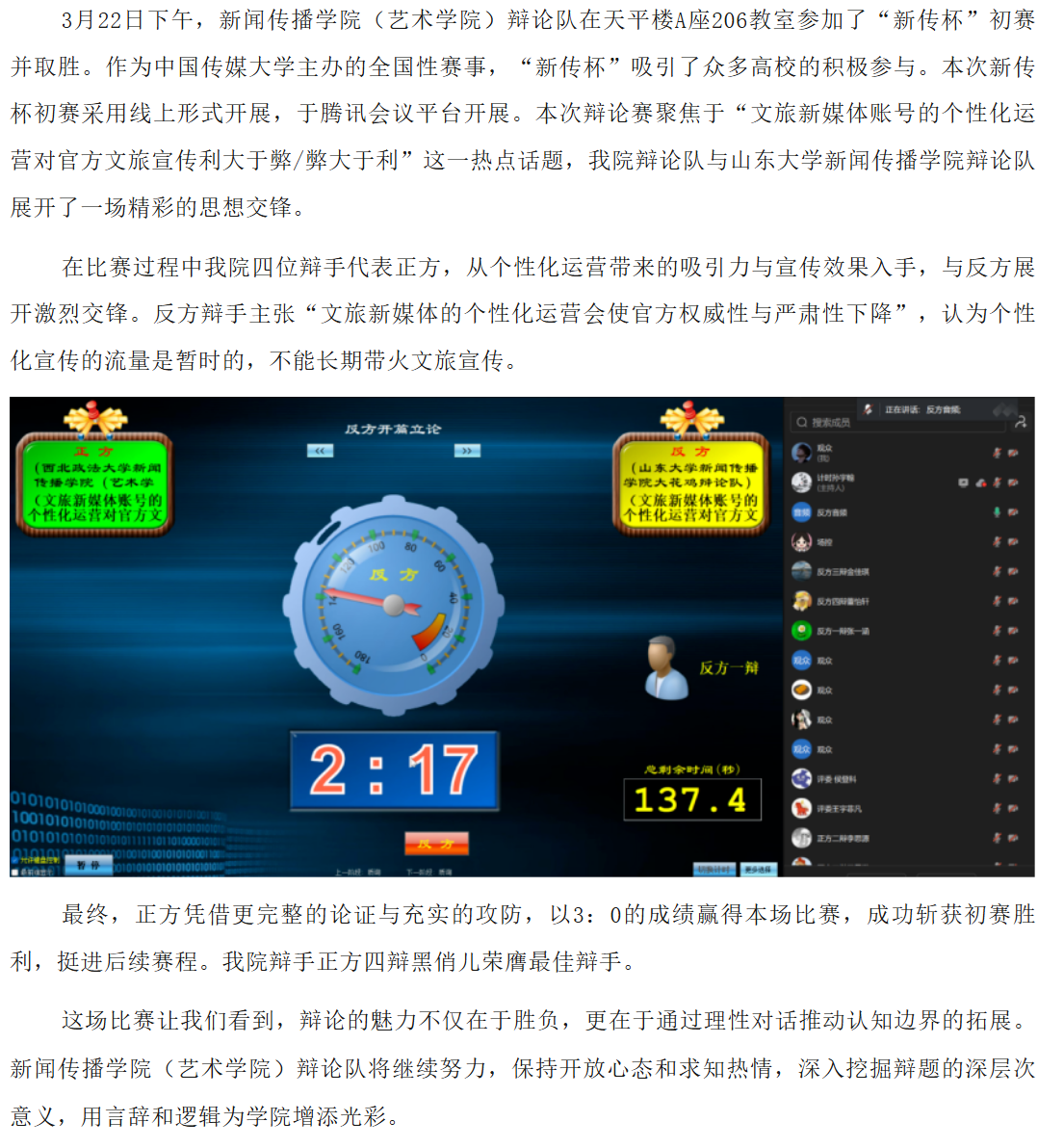 下一篇:以辩会友 思辨同行——新闻传播学院(艺术学院)辩论队与北京交通大学语传辩论队开展线上辩论交流赛
