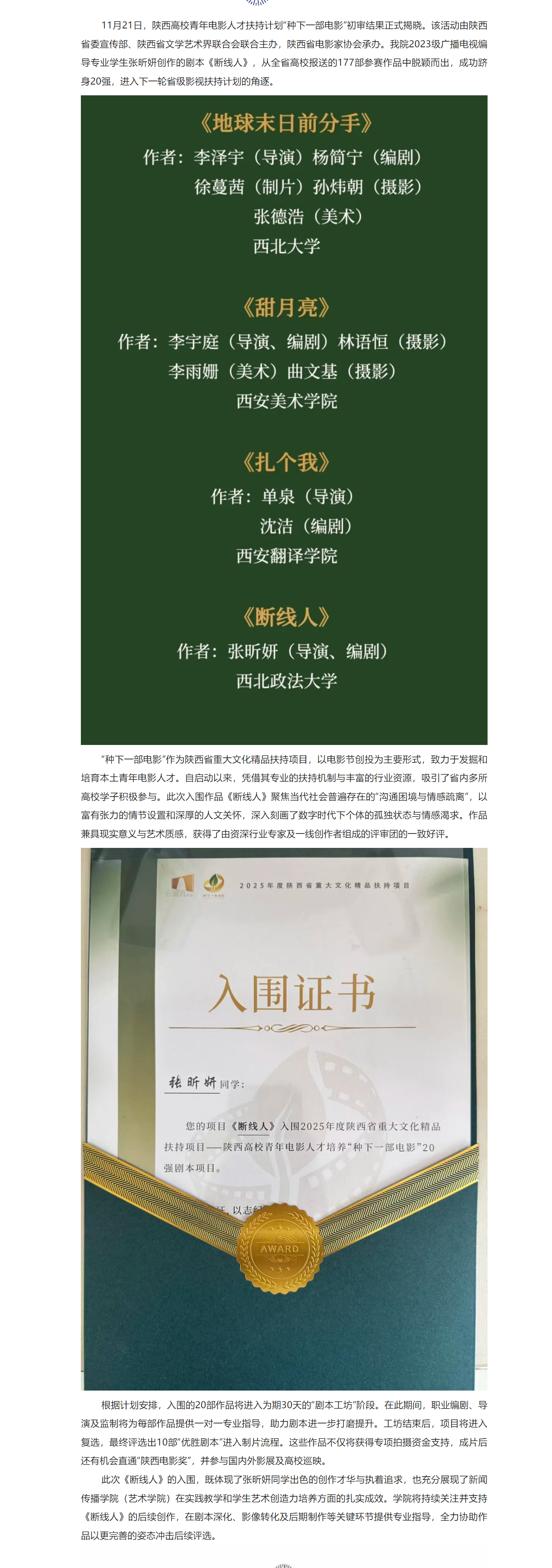 喜报三连!新闻传播学院(艺术学院)学子作品《断线人》成功入围“种下一部电影”20强