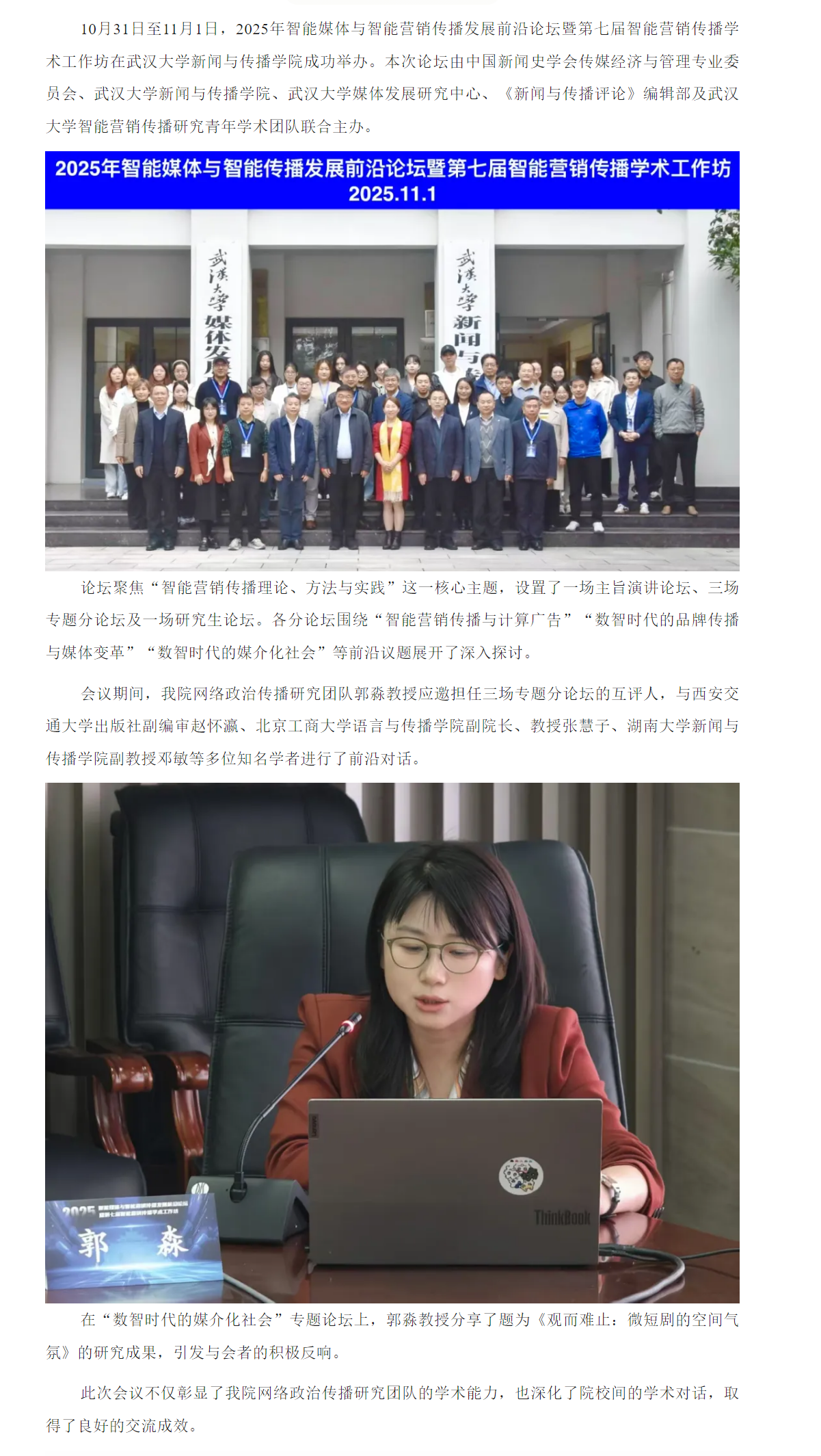 我院郭淼教授受邀参加2025年智能媒体与智能营销传播发展前沿论坛暨第七届智能营销传播学术工作坊并作发言